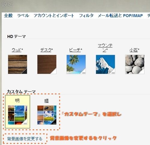 Gmailの背景が自由に変更できるようになったようです。 「設定」→「テーマ」にカスタマテーマが追加されてます。 カスタムテーマの「明」「暗」どちらかを選択すると、「背景画像を変更する」が表示されます。